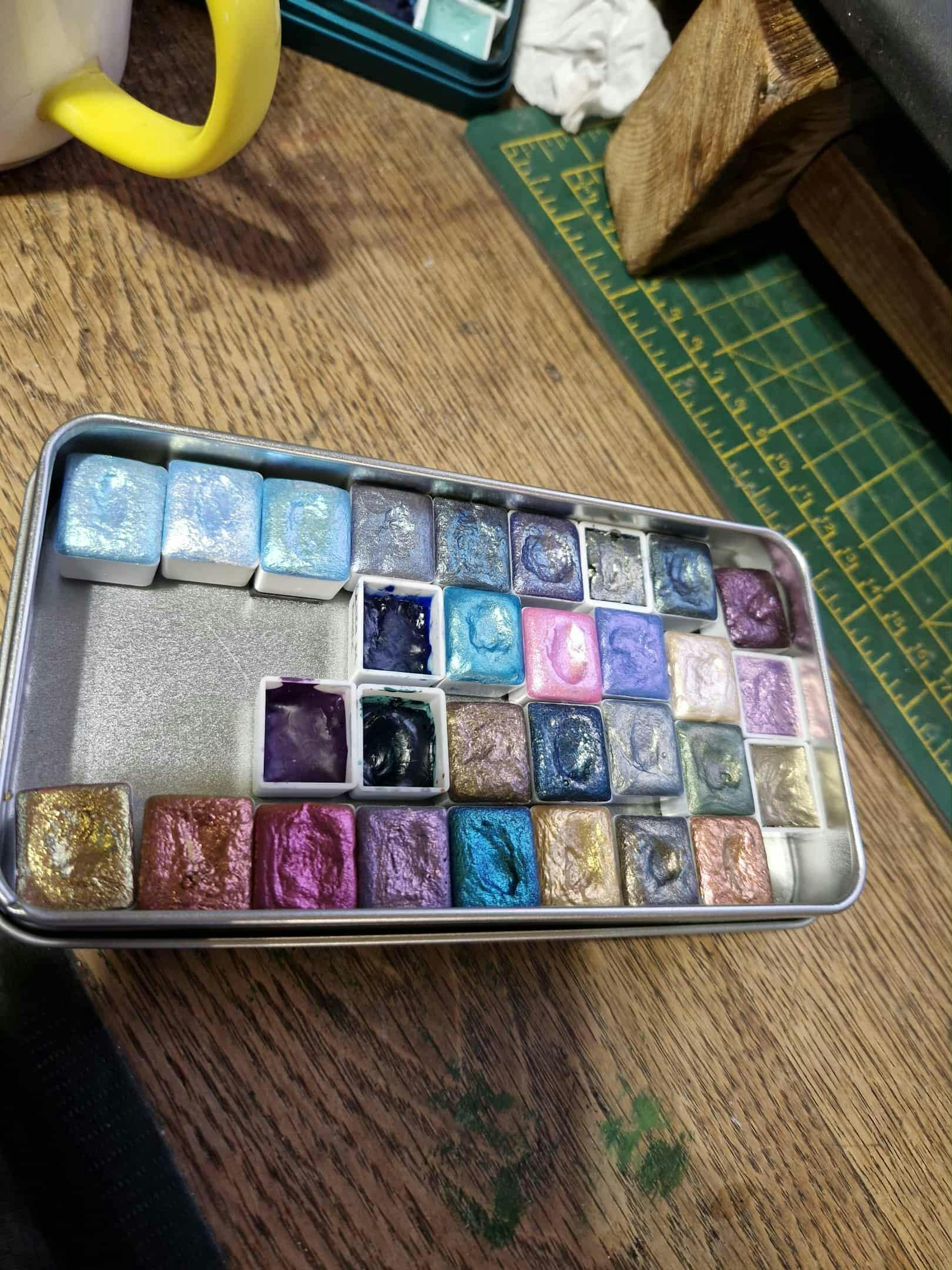 Fab little tin for half pan or full pans of watercolour paint - it will take 35 standard half pans. The removable lid makes it excellent to work from in a small space vs standard tins with the double or single fold out palette lids. You have to supply your own palette but this can be any size you want and placed wherever you want, vs having to be part of the tin.