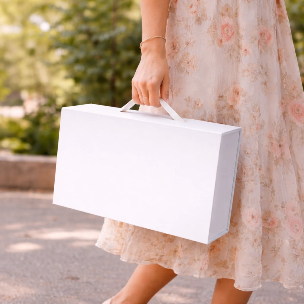 Our Luxury White Folding Magnetic Presentation Gift Box with Carry Handle is a premium packaging solution designed to combine elegant presentation with practical functionality. Made from durable rigid cardboard with a secure magnetic closure, this stylish gift box provides a sophisticated way to present and transport products.
